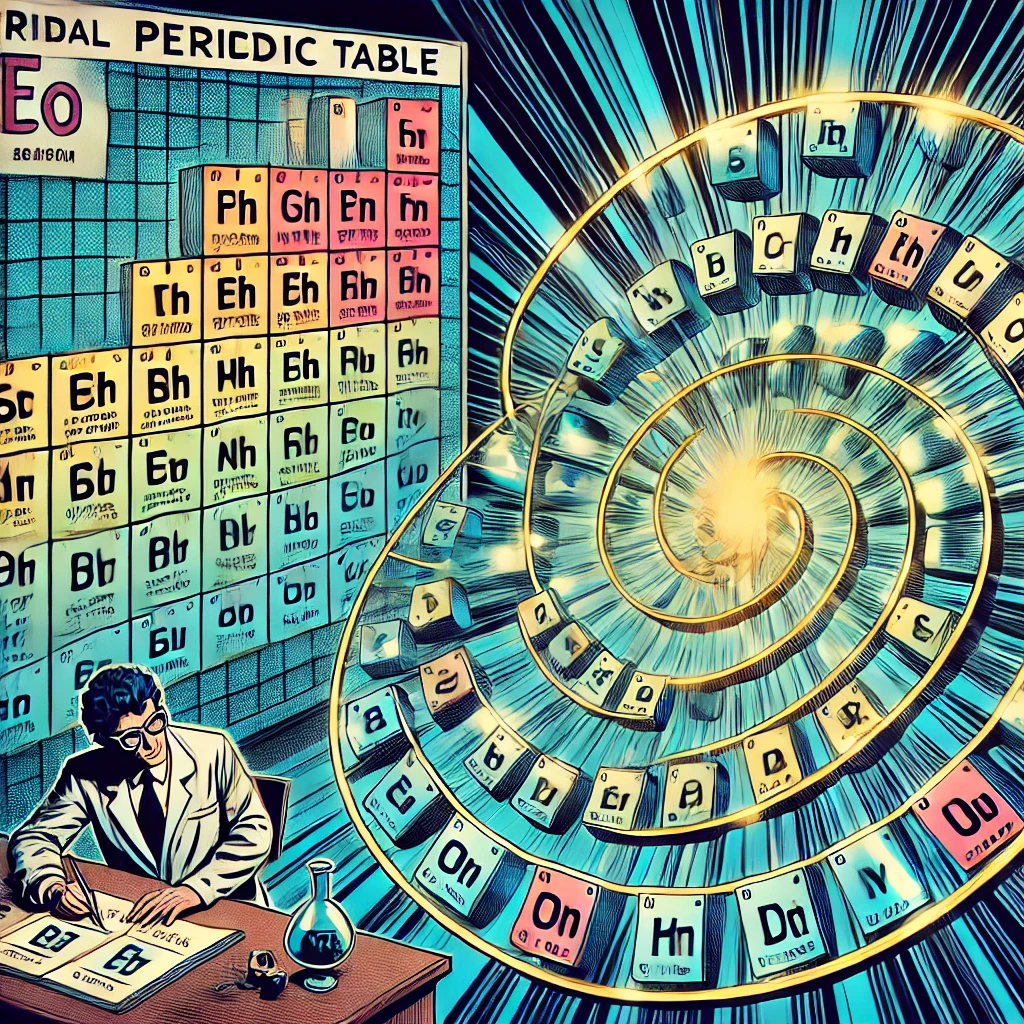 Spiral Periodic Table, an alternative representation of the traditional periodic table of elements. This design arranges elements in a spiral or helical form, aiming to provide a more intuitive visualization of the periodicity and relationships among chemical elements.