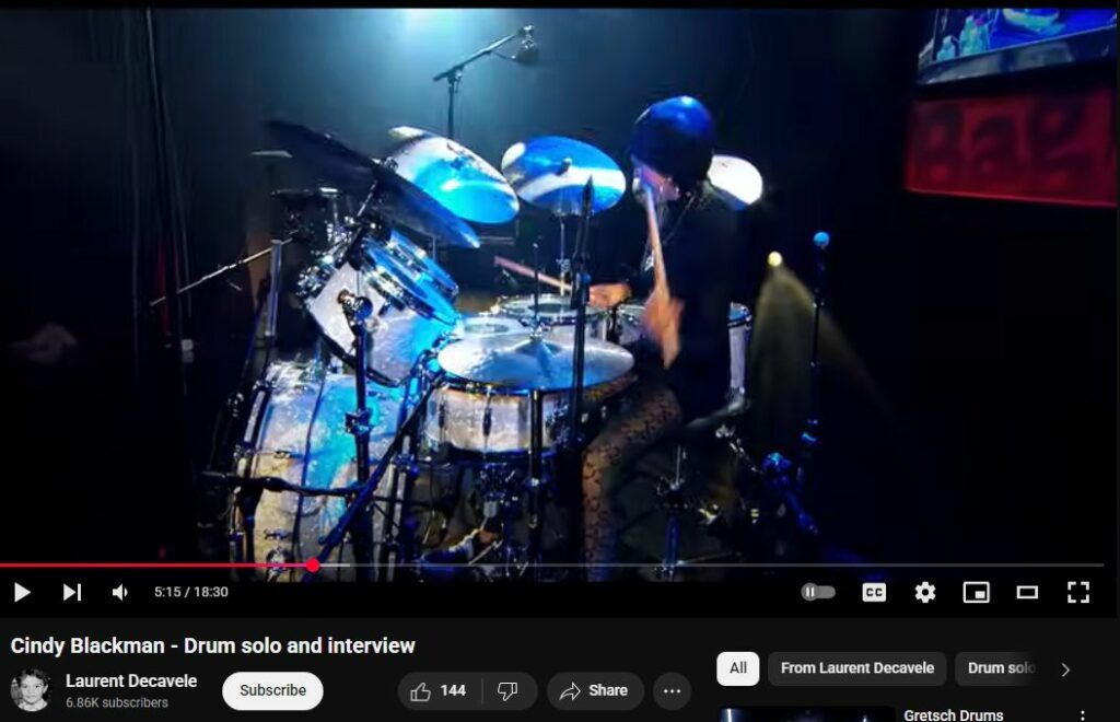 Unfortunately, this interview shows only another example of Drum Pounding Full-Blast Zero Dynamics Zero Nuance. Far from best showing, akin to screaming and totally out of character with her quote from above: “Music to me is like prayer, it’s the highest form of communication…” I’ve always thought Gretsch was more of a nuanced rather than power kit.