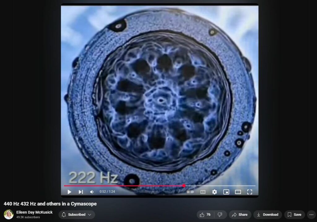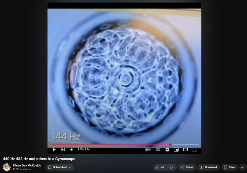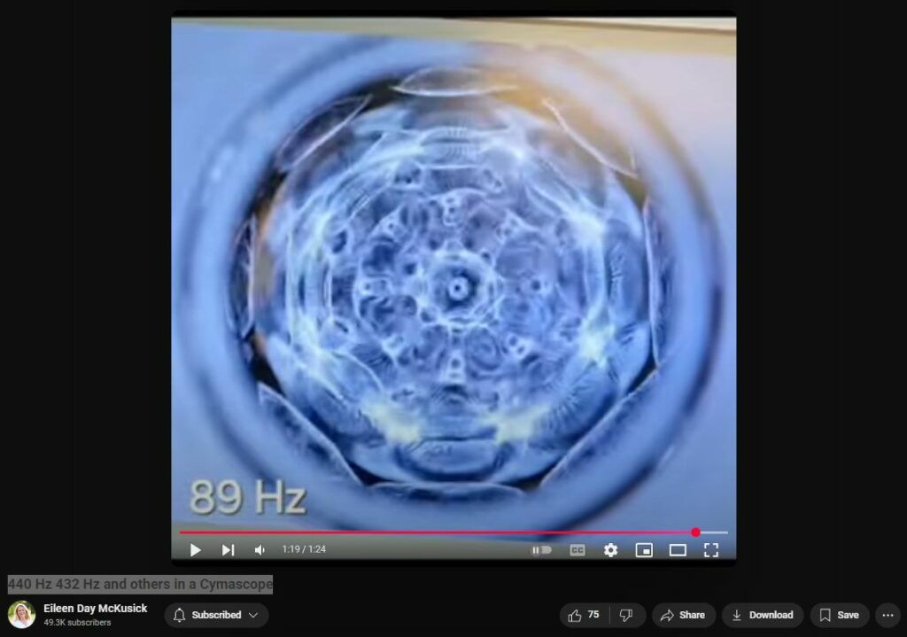 Eileen McKusick — I ran 432 and 440 multiple times through the Cymascope, in both the small and large dishes, and I could not get either of them to generate a coherent image, although I have gotten slightly more geometric patterns in the past. We don’t use the 432, 440 or 444 frequencies in Biofield Tuning (I found these tones grating to listen to), but we do have 222, 144, and 89 Hz forks, as well as binaural beats of 111 Hz created by our 417 and 528 Hz forks used together. Based on my explorations with cymatics, I would not say the 432 by itself is a “healing” tone. The 89 sure seems to be though, really lovely to look at and listen to!