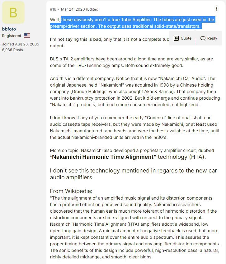 Regarding Nakamiche N40t and N60t tube car amplifiers — both of hybrid design, using 12AX7 vacuum tube input stage and transistorized power output stage(s). Many amplifiers of this (or substantially similar) design have been marketed over the past several decades. The transparent (plastic?) cover of this amplifier suggests reduced need for metal heatsink, suggesting a class-D (high-frequency switching) design to reduce heat.