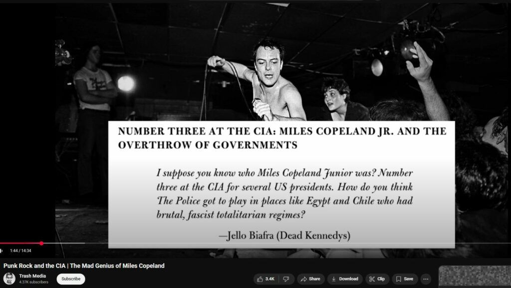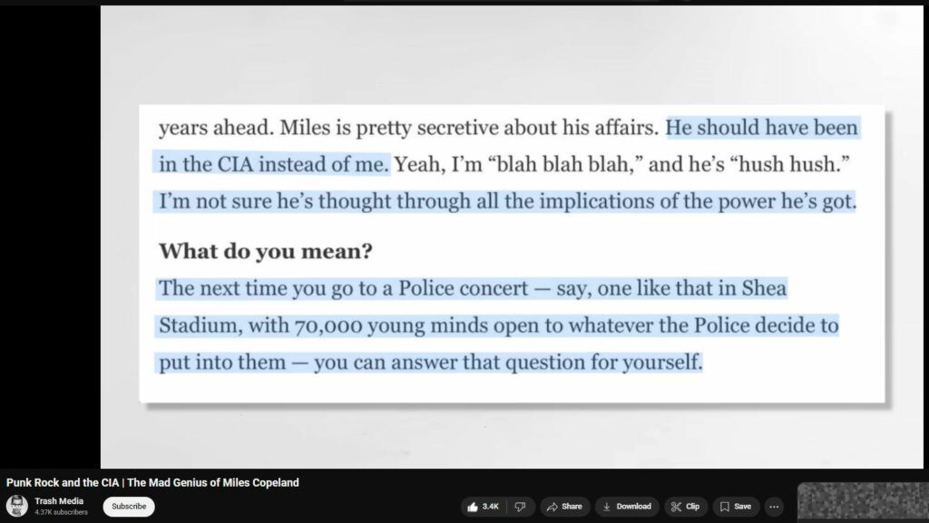 “The head of cia had one son who was the drummer for the police & the other son managing & signing bands to his record label. More specifically punk & new wave bands. This is not by coincidence. And his other son was booking his brother’s famous band and the bands his other brother would sign! While Miles Jr. was never the head of the CIA himself, he was a very powerful and influential co-founder.”