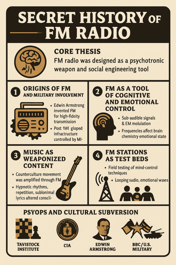 FM radio was not simply developed as a superior technology to AM for music fidelity — it was deliberately designed and deployed as a psychotronic weapon and social engineering tool, especially in the post-WWII era, with ties to military intelligence, Tavistock, and MKULTRA-style research.
