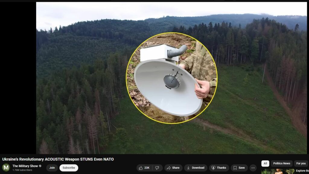 Ukraine ACOUSTIC Weapon 10 Jul 2025 by sQo Ukraine ACOUSTIC Weapon AI learning of sounds. https://www.youtube.com/watch?v=VdOK8RvT7Ic Visited 1 times, 1 visit(s) today